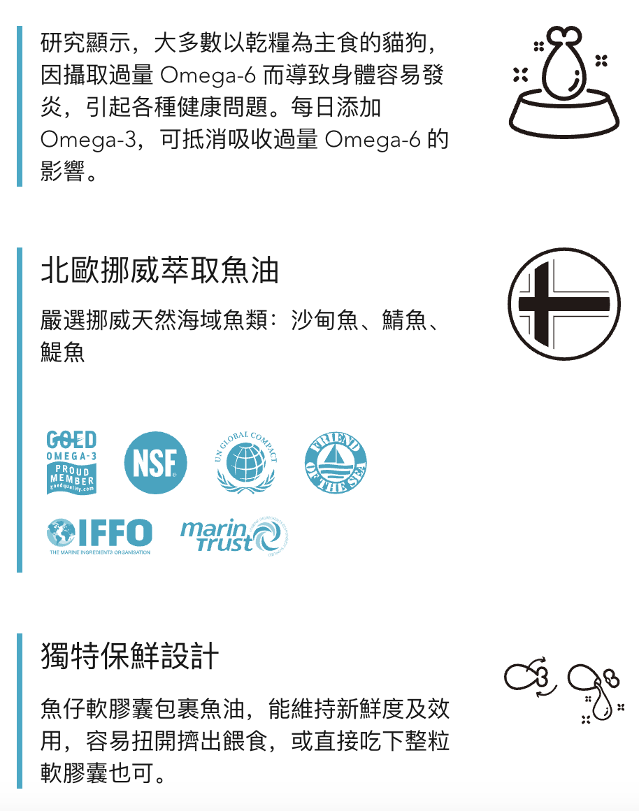 有研究顯示,Omega-3 脂肪酸有效舒緩貓狗敏感症、皮膚炎、搔癢、跳蚤過敏等問題。在貓狗日常飲食中加入 Omega-3 脂肪酸,可以減輕免疫系統過度反應,有助減少痕癢並大幅改善皮膚和毛髮健康。